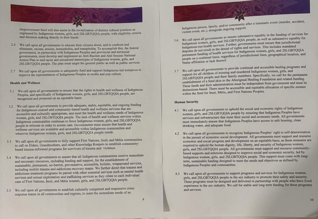 The National Inquiry’s 231 Calls for Justice are directed at governments, institutions and industries across Canada, detailing changes that should occur to resolve the challenges Indigenous communities face. These cover topics such as the rights to culture, health, and security. According to the Government of Canada, “The National Inquiry’s 231 Calls for Justice offer a powerful vision to end violence against Indigenous women, girls, Two Spirit and lesbian, gay, bisexual, transgender, queer and intersex (2SLGBTQI+) people, inspiring action across governments and partners.